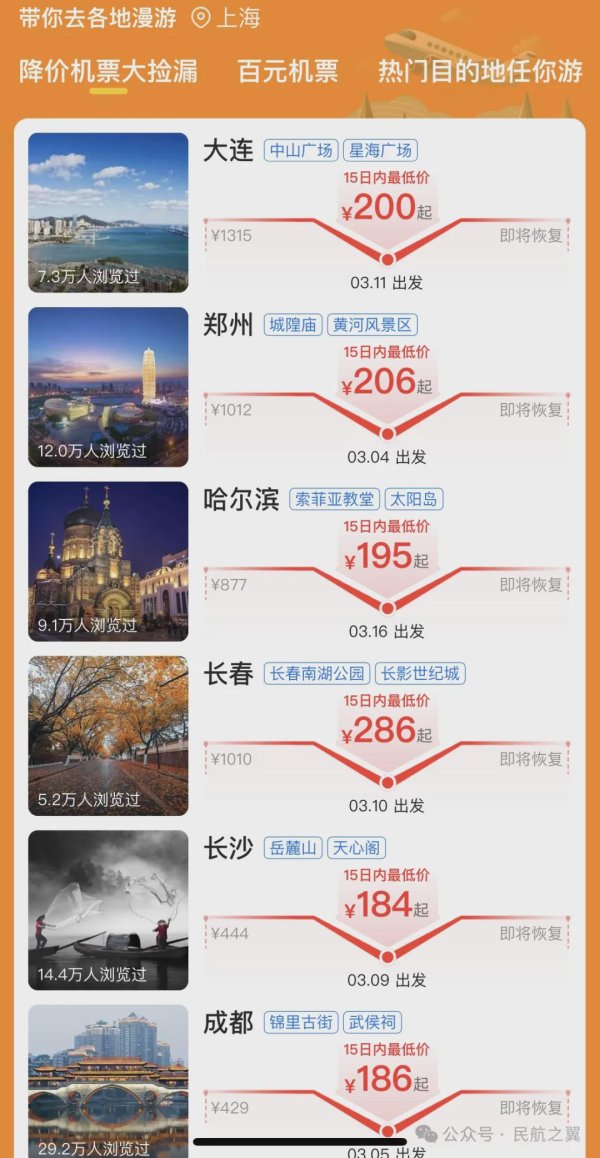 一、机票大跳水,打工东说念主出游的好契机? 最近,民航干与淡季,机票价钱又在大跳水!不少热点航路裸票价钱跌至200元傍边,险些是白菜价! 从上海启航,去成齐、重庆、西安等热点旅游城市,最低票价惟有200元傍边,异常于经济舱全价的1折。从广州飞往泸州、合肥、成齐等地,也只需200元傍边。 还有北京、杭州等城市启航的航路,相同有许多廉价机票。 不仅国内航路,海外航路价钱也裁汰不少,上海启航前去日本、韩国、泰国、新加坡等国多个标的地的机票已下落至数百元。 为什么机票价钱会俄顷大跳水呢?主要有两个原因.
