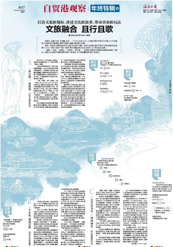 海南日报2024年12月18日第007版版面图 海南日报全媒体记者 刘晓惠 陈楚生、赵雷、朴树、王栎鑫、张远……12月14日至15日,三亚崖州湾芒禾音乐节开唱,6.3万名歌迷从世界各地集聚鹿城,畅享海角音乐盛宴,感受旅行乐趣。 前有一场坎耶·维斯特试听会让海口辞世界“出圈”,后有三亚崖州湾芒禾音乐节带动旅游空洞糜费5.1亿元,“演艺+旅游”“音乐+旅游”等文旅会通新业态活力迸发,放荡带动空洞糜费。 一部剧、一条路、一场上演、一次展览、一项非遗……在海南,新鲜的文旅会通状态接连涌现,为闲散东谈主.