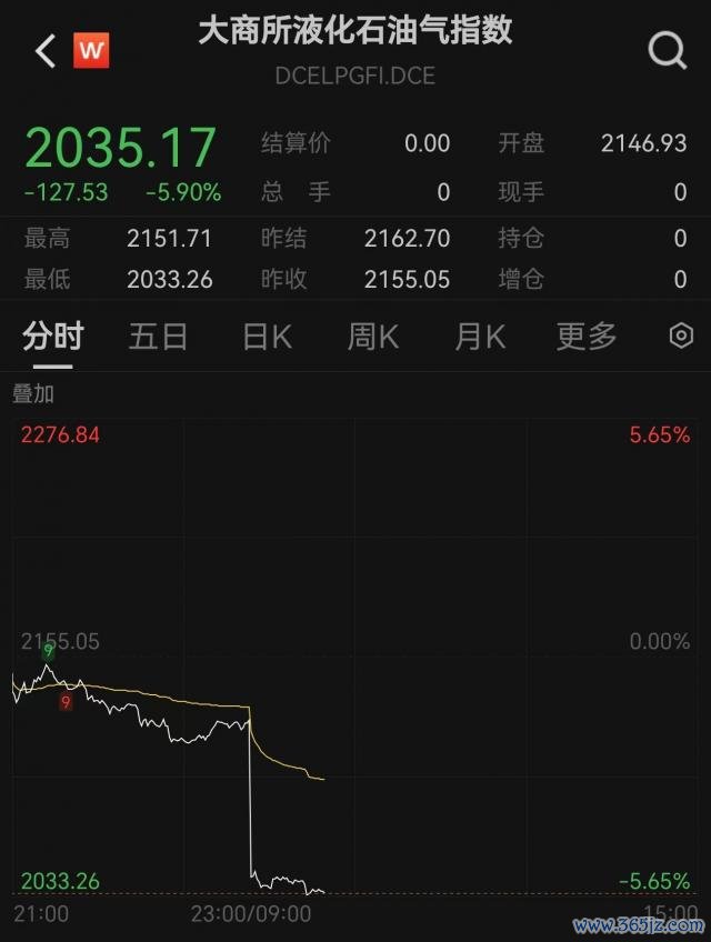 液化石油气(LPG)期货主力合约涉及跌停,大商所液化石油气指数直线下落近 6%。