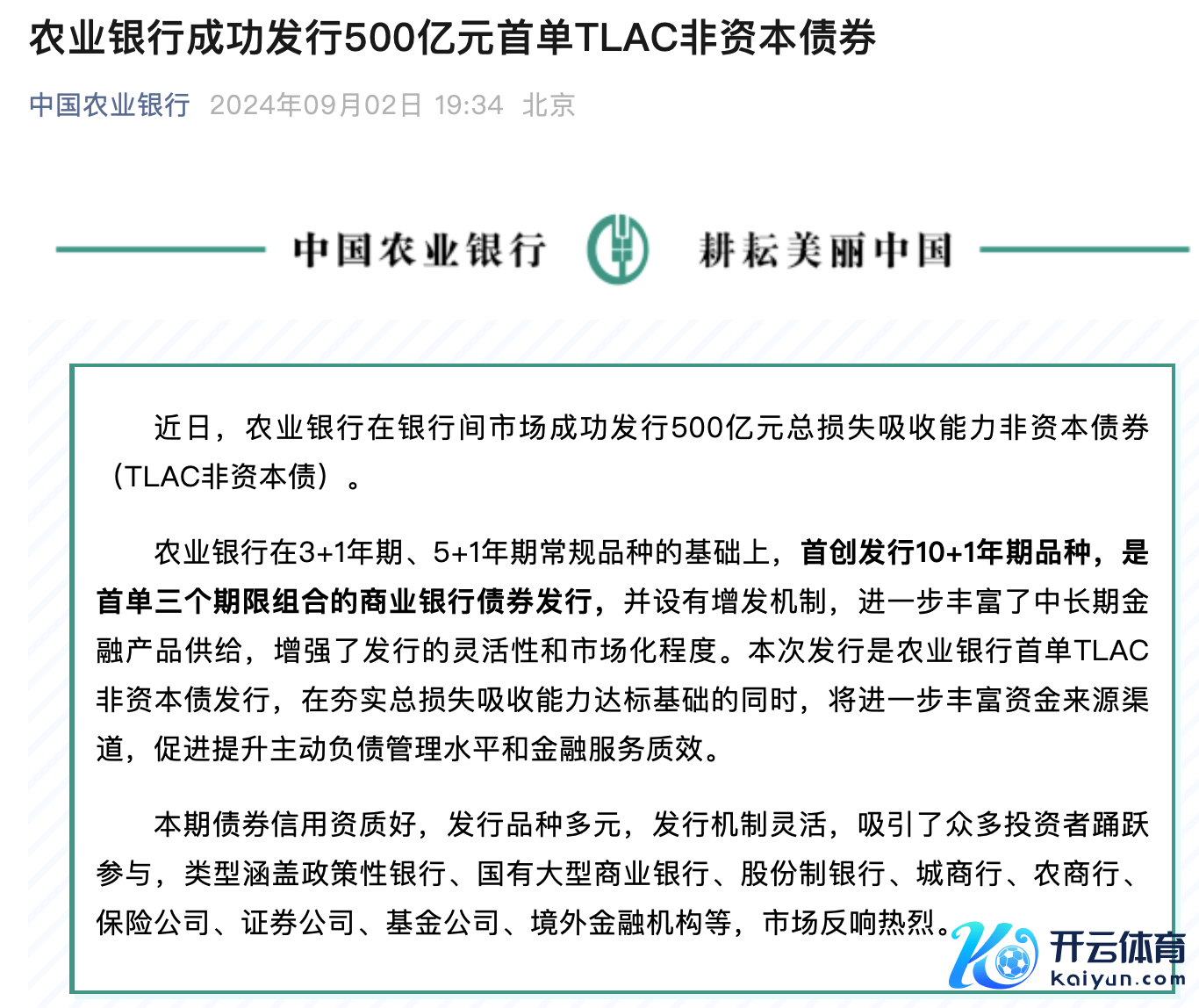 中国农业银行顺利刊行500亿元首单TLAC非成本债券开云体育中国农业银行顺利刊行500亿元首单TLAC非成本债券