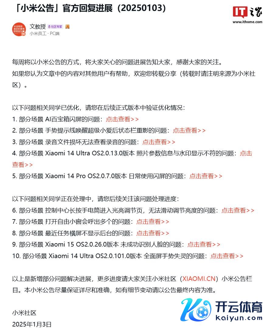IT之家 1 月 5 日音问,官方本月(1 月 3 日)在小米社区发布公告,公布了彭湃 OS 2 Beta 问题优化发达,其中提到小米 14 Pro / Ultra 手机体验问题的优化情况。