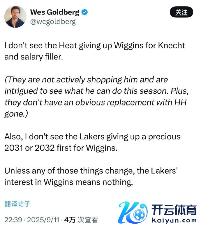 北京技巧9月12日,当湖东谈主续约东契奇,笃定往常以东契奇为十足中枢建队,他们就对引进维金斯辅佐东契奇极为感兴味。不外如今凭证热火记者Wes Goldberg辟谣表态开云体育,热火不会往复维金斯,尤其是湖东谈主给出的筹码毫无眩惑力,且也不以为湖东谈主会为了维金斯毁灭首轮签。