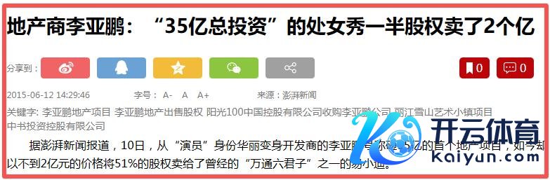 2013年,李亚鹏干了一票大的,他在丽江江束河古镇圈地408亩,告示斥资35个亿作念“雪山艺术小镇”,可是倾注悉数心血的形状繁荣兴旺干了只是两年就濒临资金链断裂,被他用51%的股份贱卖了2个亿。
