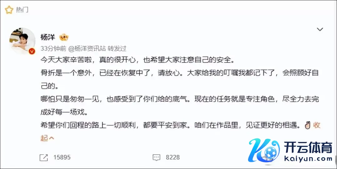 2月22日,演员杨洋在外交平台发文,恢复手部骨折: