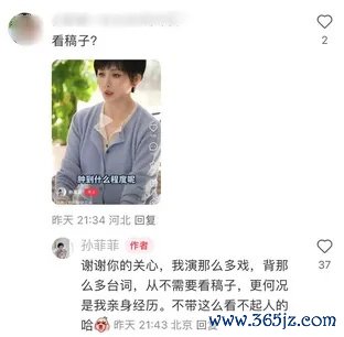 视频发布后,有网友质疑她是对着镜头念稿子,孙菲菲否定:“我演那么多戏,背那么多台词,从不需要看稿子,更而且是我的切身阅历,不带这样轻蔑东谈主的哈。”