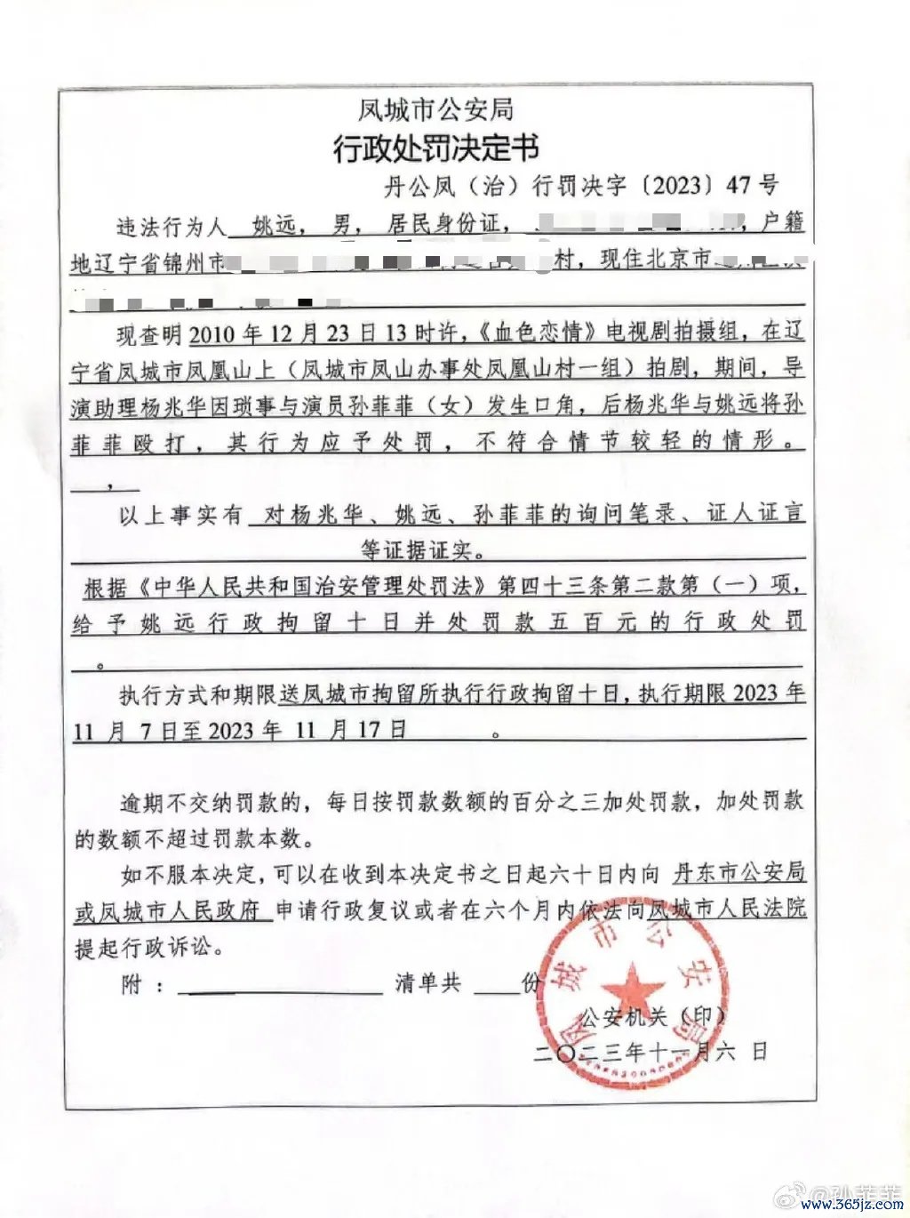 11月14日,孙菲菲晒出我方遇到的《血色恋情》剧组暴力事件最新说明:辽宁丹东凤城市公安局开具的行政责罚决定书闪现,该局对姚某作出行政拘留旬日并罚金五百元的决定。