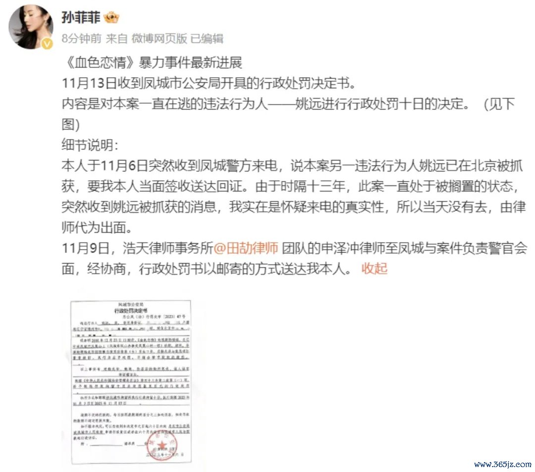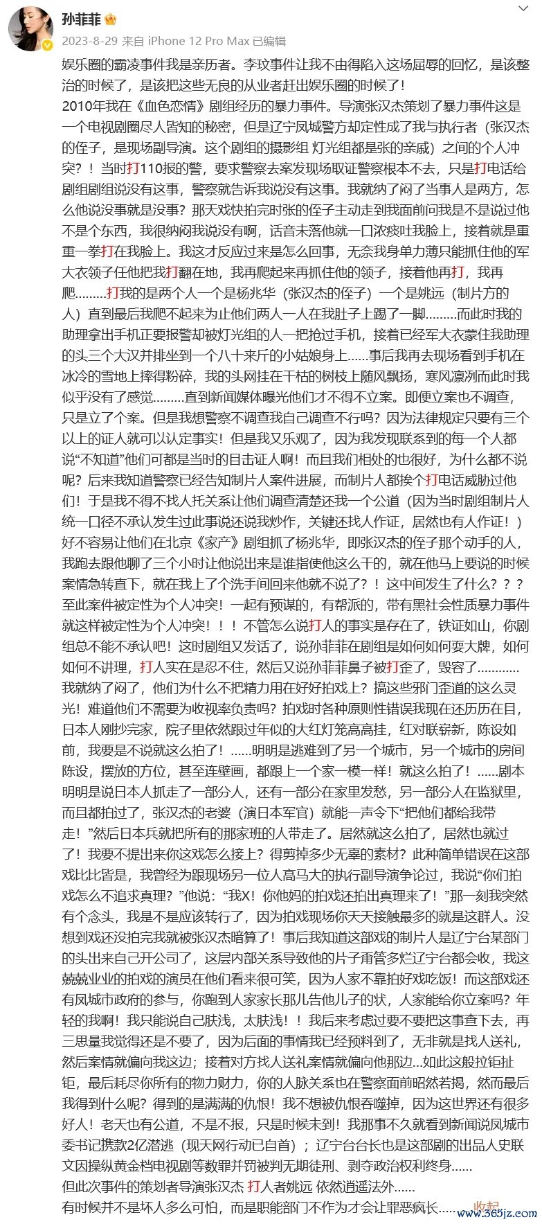 2023年8月29昼夜深,许久未出面的演员孙菲菲发文称:“文娱圈的霸凌事件,我是亲历者。”随后,她在长文中曝光我方2010年在电视剧《血色恋情》剧组,疑似遭受导演张某杰规划的“暴力事件”。长文中称张某杰是规划者,姚某和杨某华是打东谈主者。