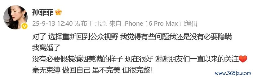 孙菲菲发文:“对了,聘任重新回到公众视线,我以为有些问题我如故莫得必要瞒哄。我仳离了,莫得必要假装婚配完全的阵势,刻下很好,谢谢一又友们一直以来的眷注。毫无抑制,作念回我方,虽不竣工,但很完整!”