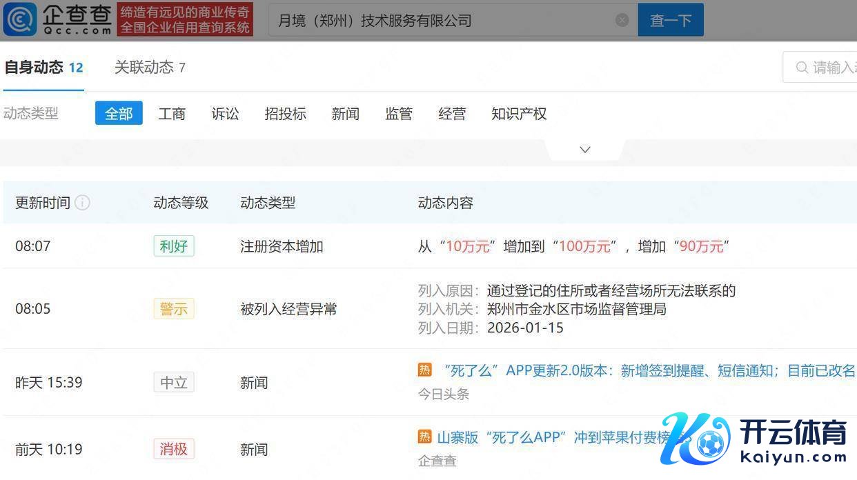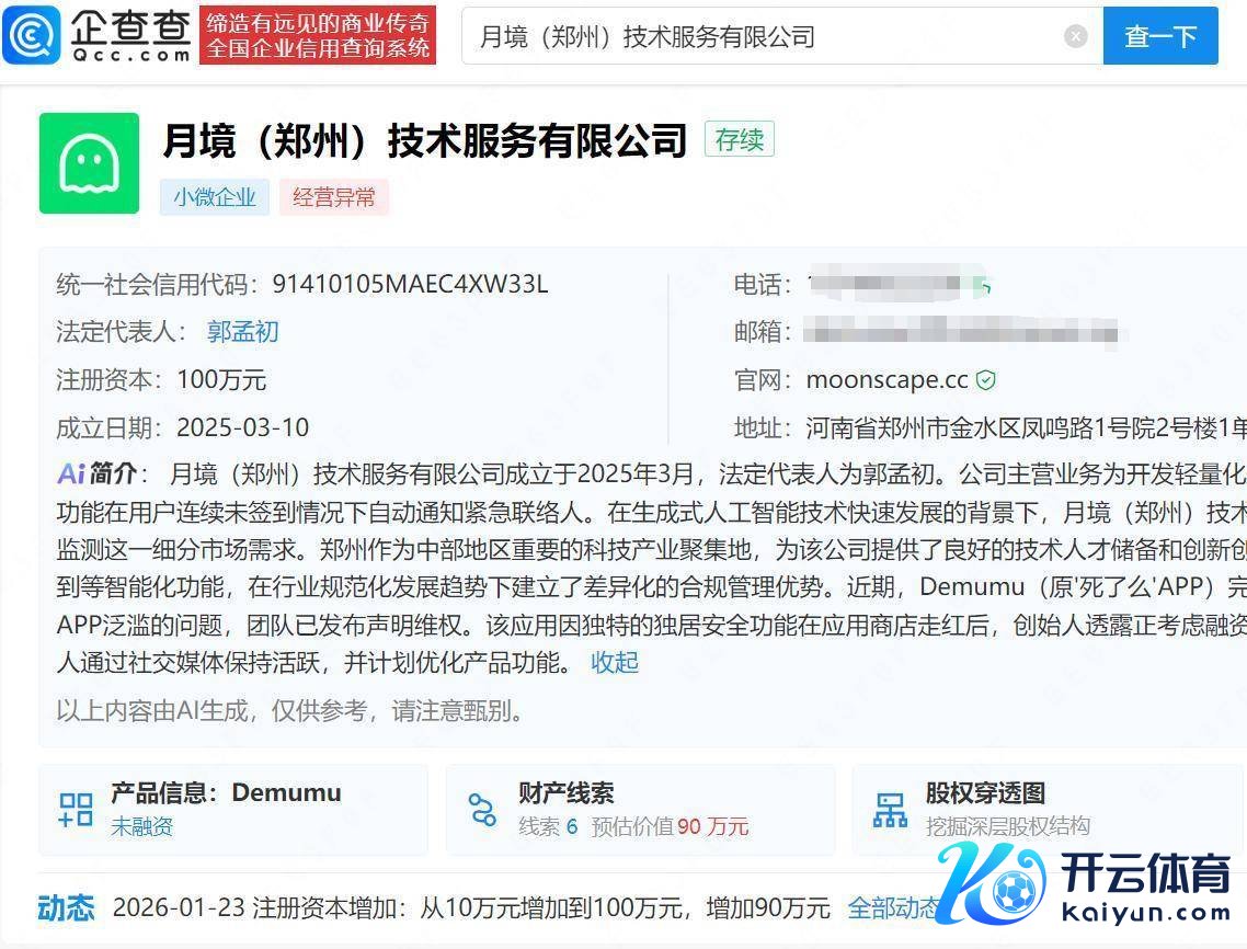 企查查APP知道,近日开云体育(中国)官方网站,死了么APP开发主体月境(郑州)技艺工作有限公司因“通过登记的住所大概忖度场面无法有关”被郑州市金水区市集监督科罚局列入忖度相等名录。该公司斥地于2025年3月,由郭孟初全资捏股并任法定代表东说念主,忖度边界包含生物技艺开发、推行室试剂的研发、坐褥、批发零卖等。1月20日,该公司注册老本刚从10万增至100万元。当今死了么APP在部分地区App Store上线2.0版块,并改名“Demumu”。