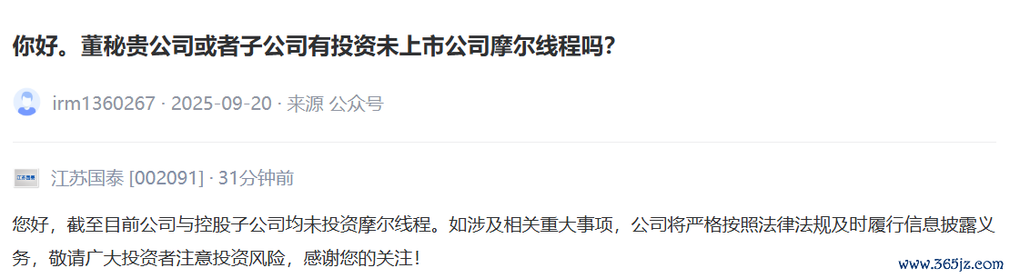 上证报中国证券网讯江苏国泰23日在互动平台上修起投资者发问时暗示开云体育(中国)官方网站,扫尾现在公司与控股子公司均未投资摩尔线程。