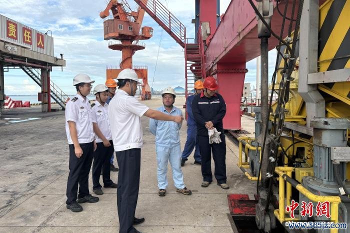提醒有关东说念主员作念好船埠大型树立加固。林耀涛 摄